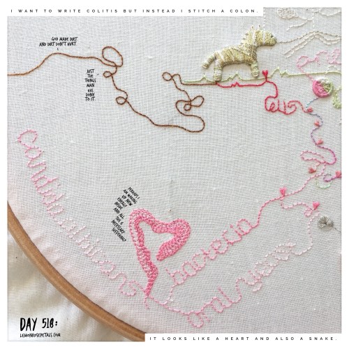 When I fall off the canvas with the brown (literally), I switch to pink, returning to the words I am trying to make space for. I’m feeling quite proud and a little bit in love with “Candida albicans”, “bacteria” and “oral yeast”, although when the waiter passes by I blush. I want to stitch “colitis”, too, because I’ve also got that. But instead I decide to sew a colon. It compliments the lungs that I made right at the start and is also a little bit different. When I’m through, it looks a bit like a heart and a coiled snake and makes me think of Kundalini yoga. Perhaps I am waking up new energy inside and all this is necessary suffering?