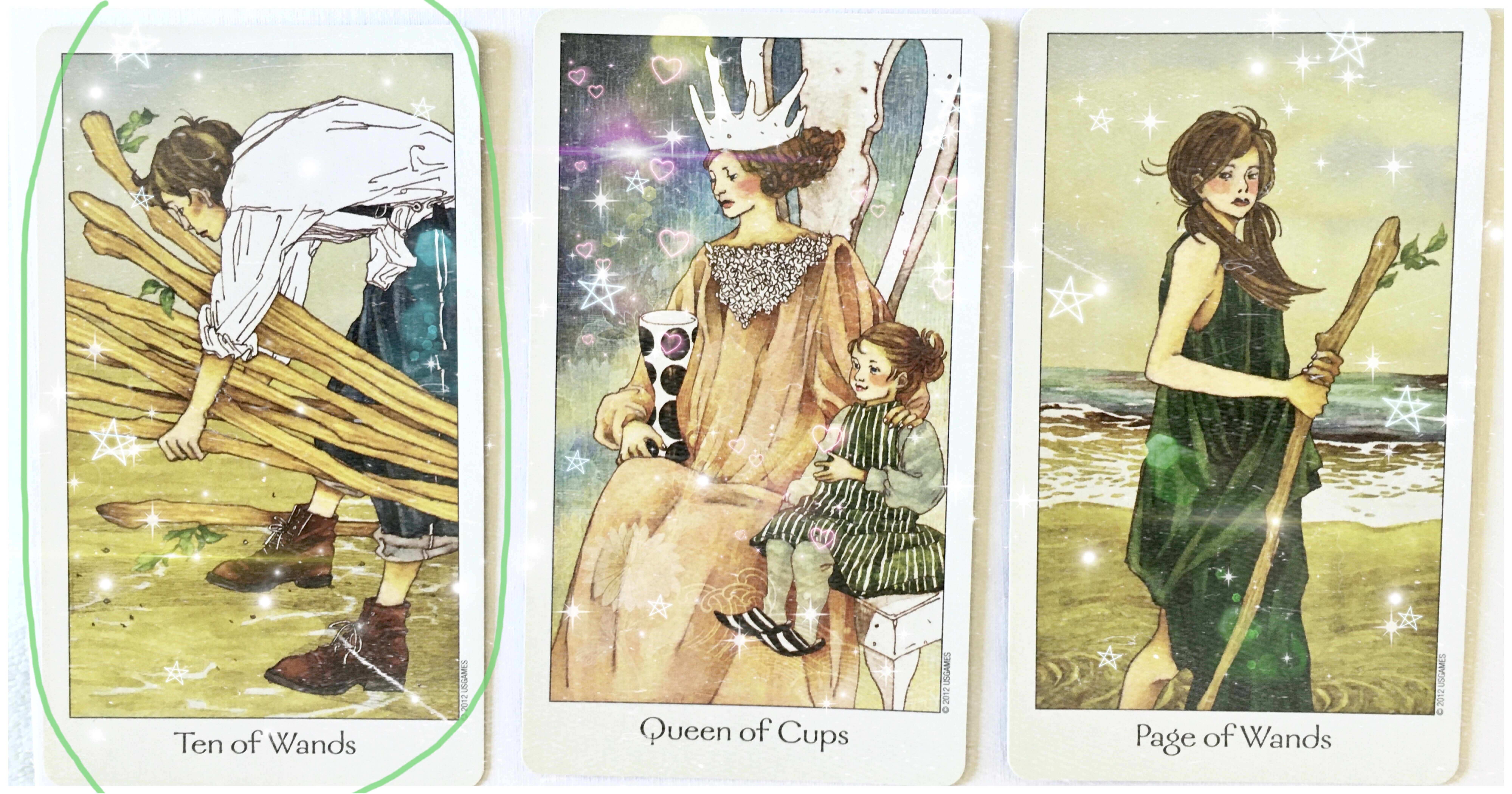 Our card for Monday, Tuesday and Wednesday is The Ten of Wands. In it we see a man – worn thin, exhausted, bent double – picking up sticks. Yet as he stoops to pick the next one up, note how he’s also dropping several more from the pile he’s collected previously, sabotaging what he already has in attempting to manage and juggle more. This card is is telling you to stop being everyone and eveyrthing’s “yes” (wo) man and instead start becoming your own personal advocate, for if you don’t look after yourself, pretty soon you won’t be much use to anyone else either and nobody wins. Try putting down a few wands. Experiment with how it feels to have a “later” list and even to say “no”. Saying “no” can be super scary and even rock a few boats, but it gets easier and people do adapt. And soon you’ll be feeling so much better anyway, what other people say and think won’t matter so much. Start by listing the things you are carrying and sorting them in order of importance. You aren’t super human. You can’t be all things to all people. So work out who and what you want to serve and put that and them first. Later – if you have space, energy and time – you can add to this with things further down your list.